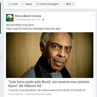 Gilberto Gil conseguiu derrubar na Justiça publicação do site Pensa Brasil notícia falsa em que o cantor chamaria Sergio Moro de "juizinho fajuto". A notícia foi retirada do ar, por força de uma liminar concedida pelo Tribunal de Justiça do Rio, mas a publicação no Facebook continuava sendo exibida na manhã desta quarta-feira. Segundo a advogada Leticia Provedel, que representa Gil, o post deve ser retirado no máximo até esta quinta-feira.