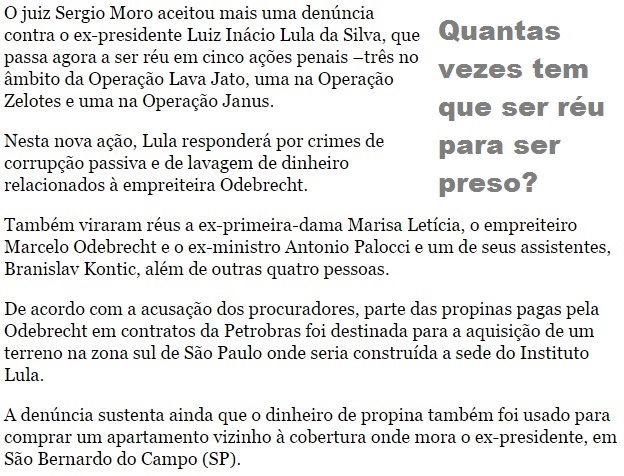 "Moro aceita denúncia e Lula vira réu pela quinta vez"