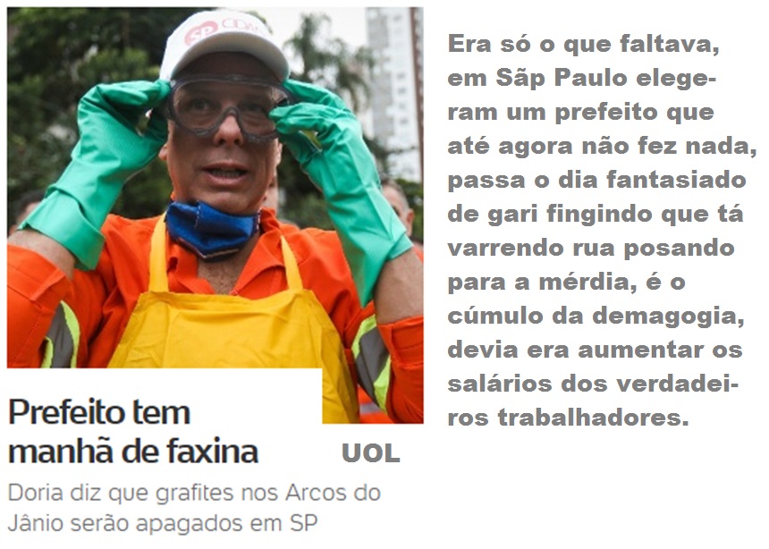 O chão tá limpo e lavado, não tem sequer 1 papel de bombom jogado na calçada e provavelmente os recipientes de lixo também são novinhos, nunca foram usados, assim como as vassouras e uniformes. Pra completar a farsa, o Óleo Dória tá de tênis e não de sapato do uniforme dos garis.